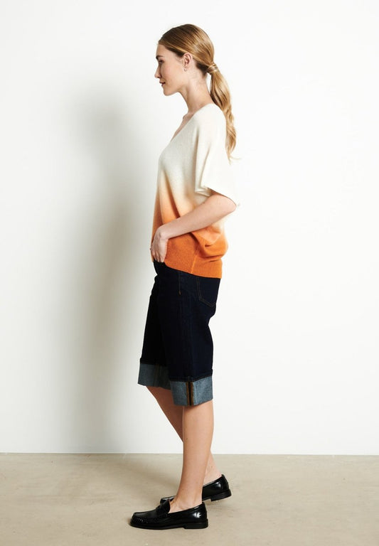 Pull col V cachemire blanc écru/imprimé orange citrouille femme - RIA 7A