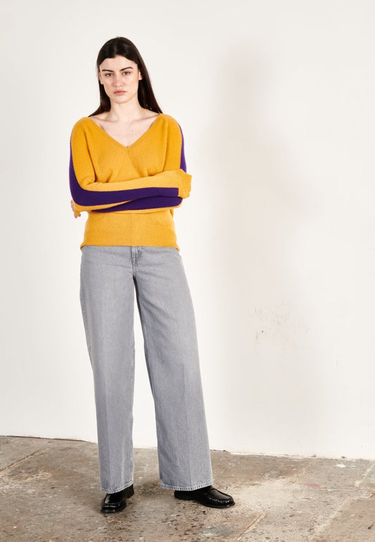 Pull col V cachemire moutarde/violet femme - RIA 1