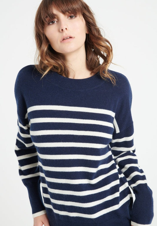 Women's navy blue/ecru cashmere crew neck sweater - LILLY 24