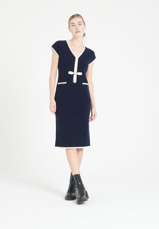 Women's navy blue/ecru cashmere V-neck midi dress - MIA 2