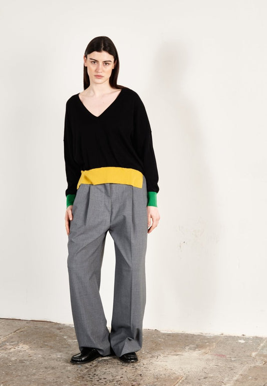 Pull col V oversize ultrafin cachemire et laine noir/vert/jaune femme - KELLY 10