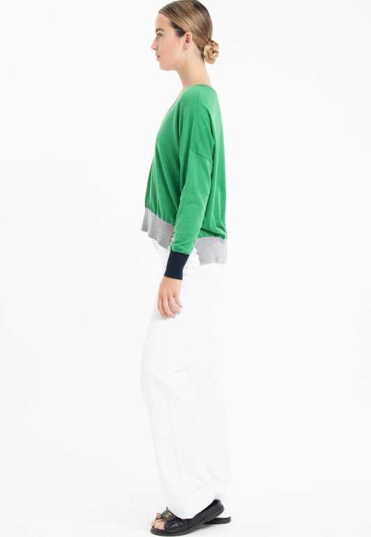 Women's oversized ultra-fine cashmere and wool V-neck sweater in green/navy blue/grey - KELLY 10